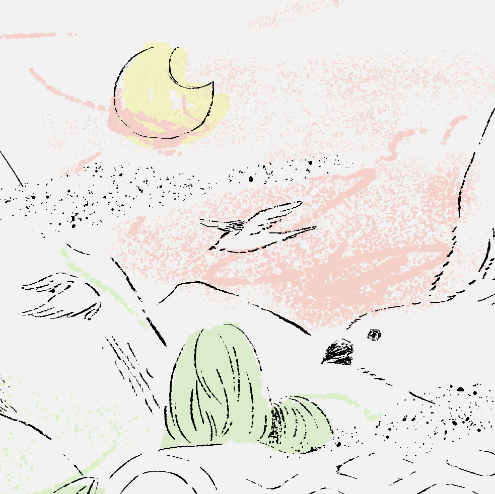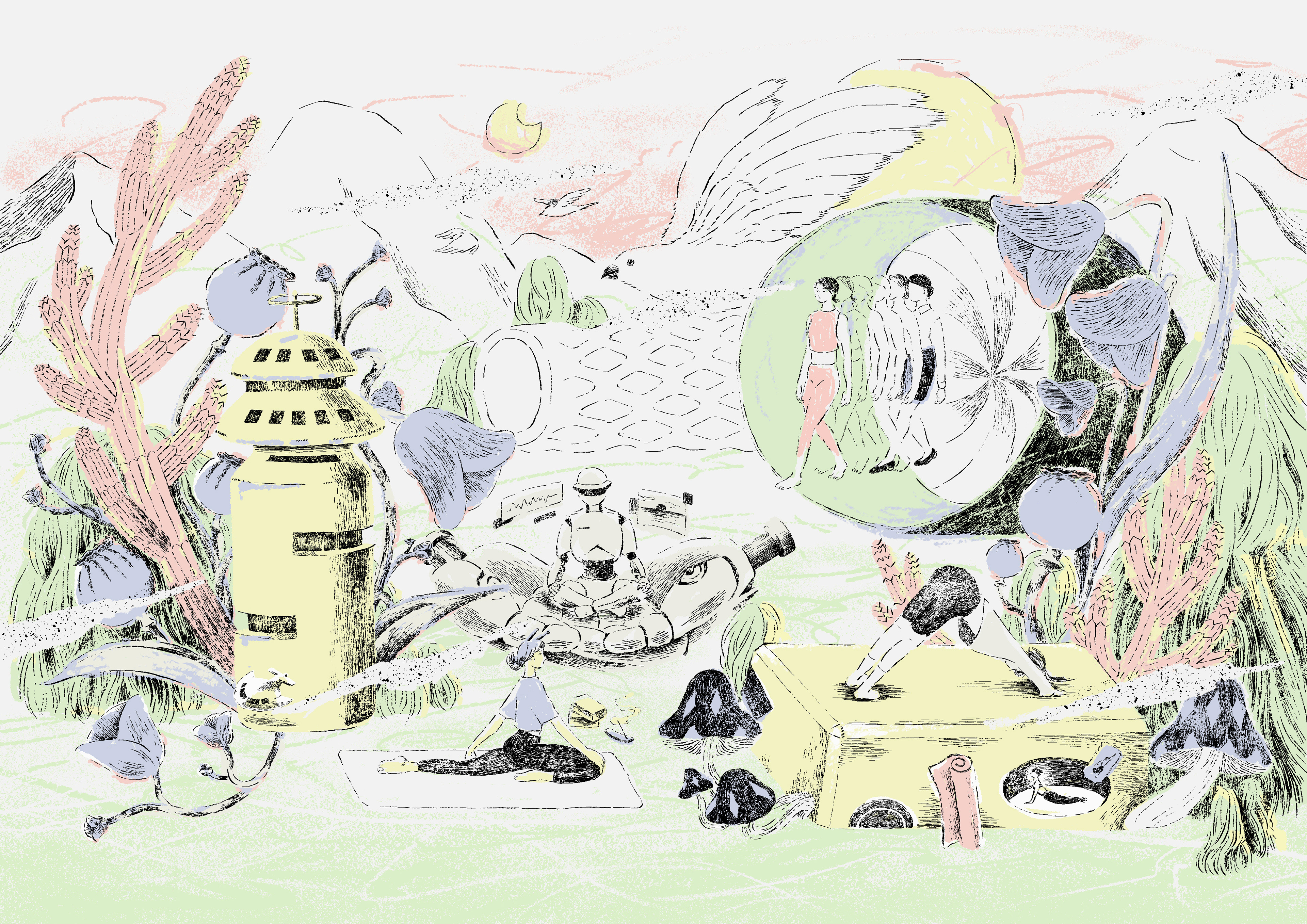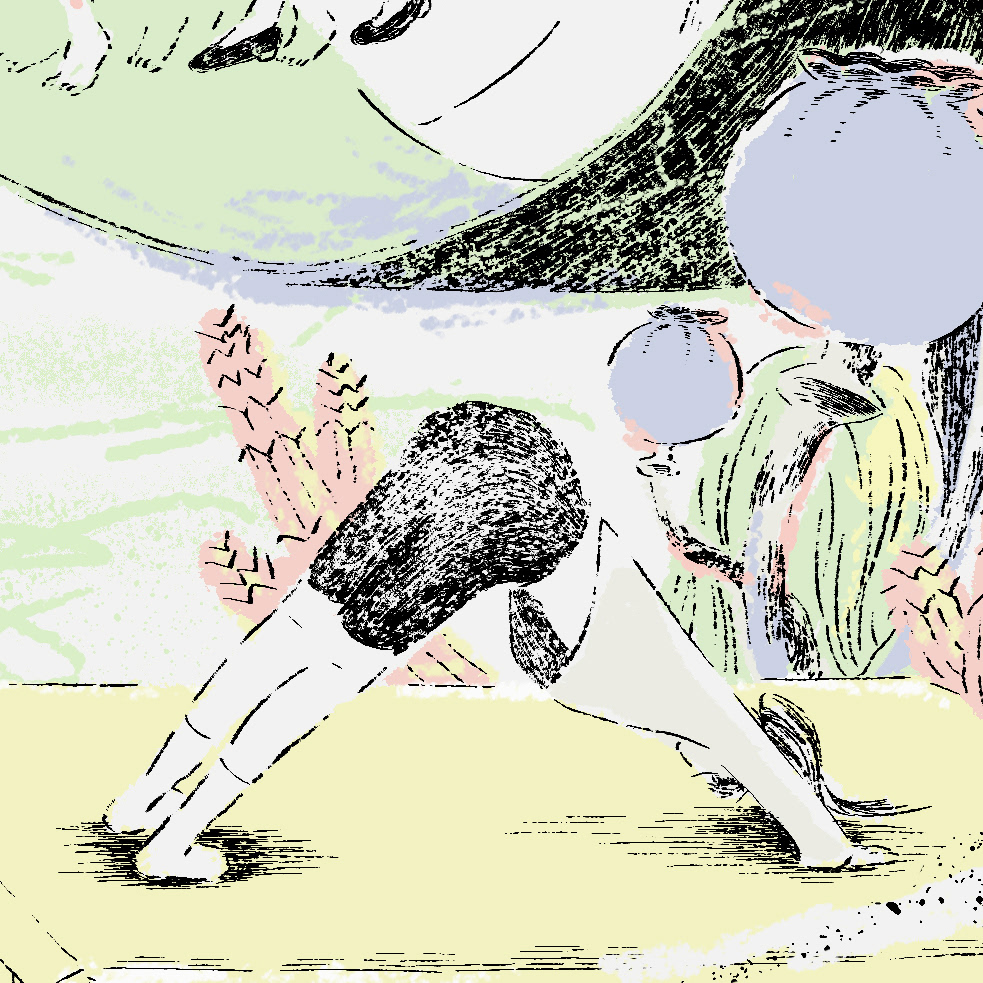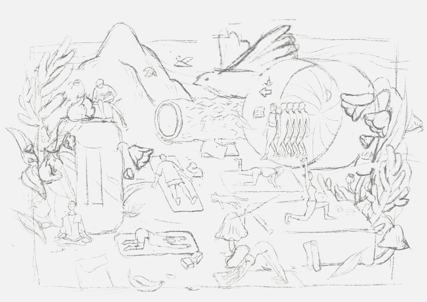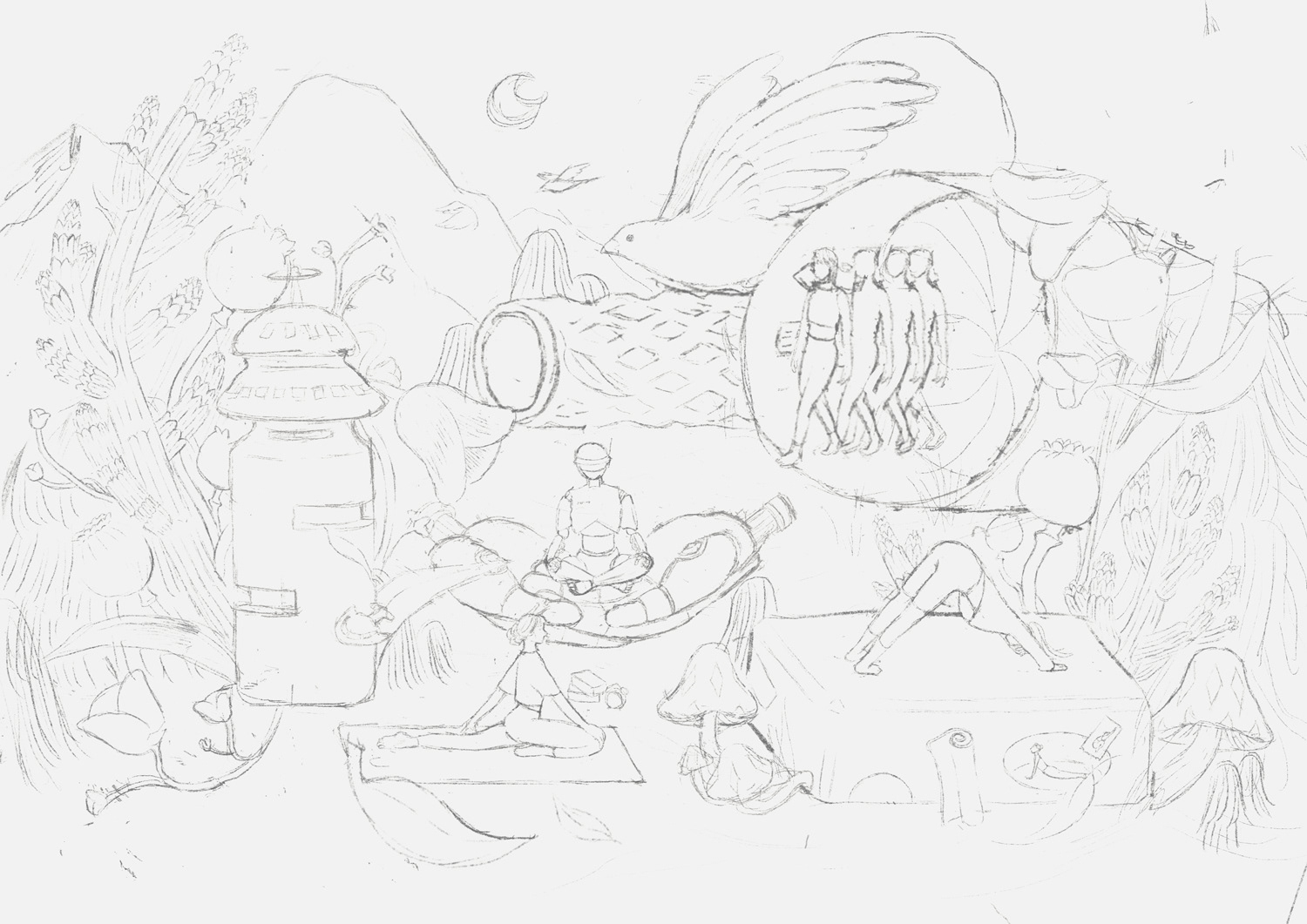 這個專案最一開始只是想畫很單純的瑜伽運動(圖左),但畫的過程中感覺越畫越沒勁,感覺這張圖只是在表達運動,缺乏趣味性,於是就加入了喜歡的科幻元素(圖右),現在我很喜歡這張圖。